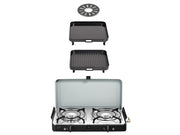- Versatile, low-pressure camping stove with stainless steel top and two independent burners. Lightweight and easy to transport. Ideal for camping, tailgating, or caravanning.